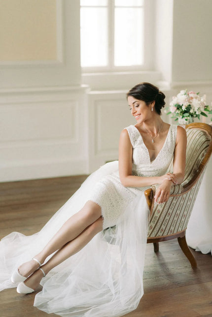 Bien es cierto que los vestidos de novia largos pueden esconder unos zapatos planos, pero,la idea no es disimular que llevas unos zapatos de novia cómodos, sino de lucir con elegancia la ausencia de tacones.