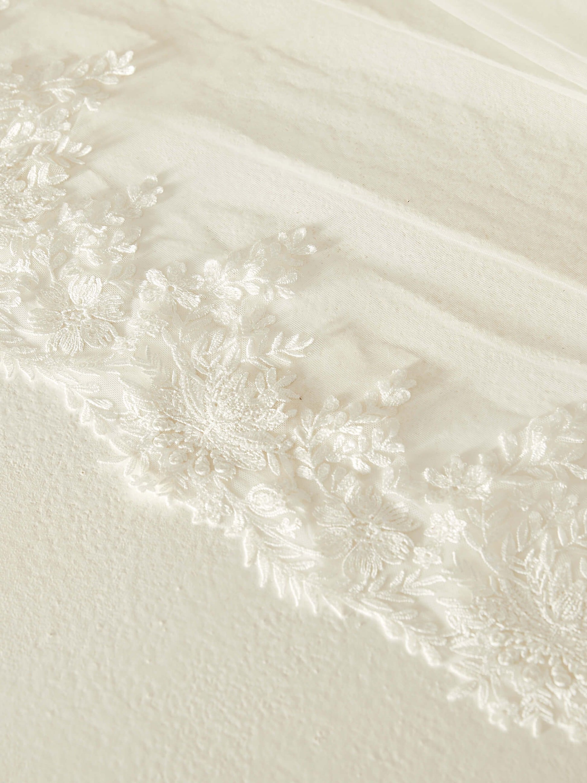 Made with diamond tulle and finished cut at the top and with lace at the end. Symmetrical cut. We fall in love with this veil for the elegance and class it gives the bride.