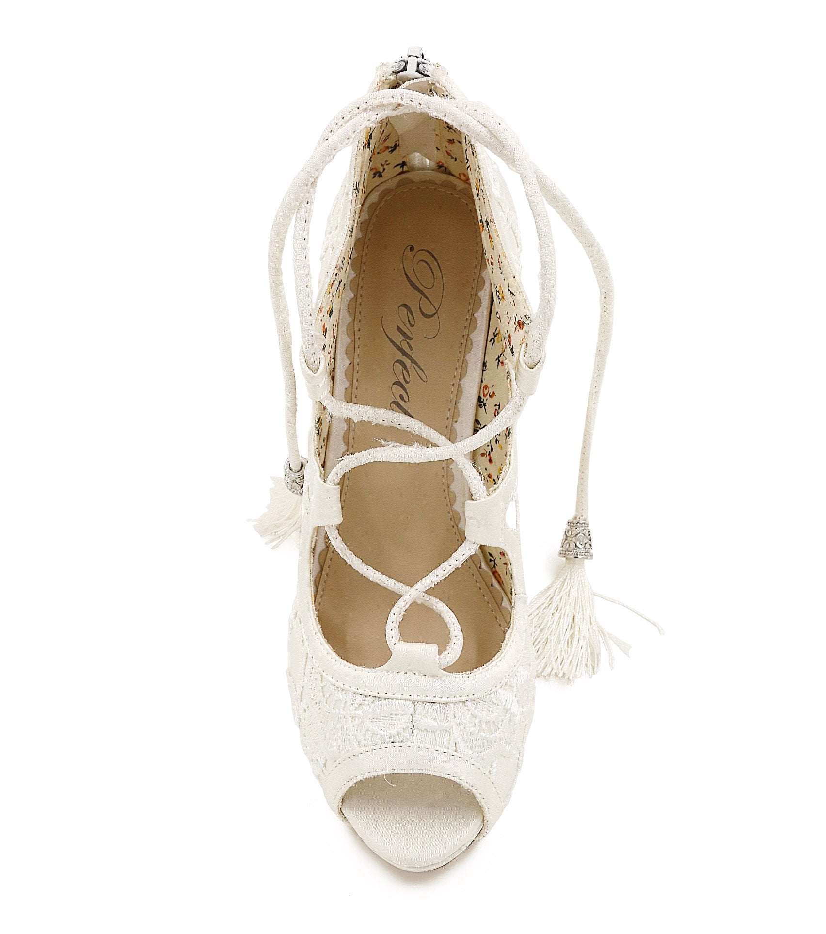 Hermoso zapato con tacón alto, punta abierta y recubierto con encaje en todo el zapato.
