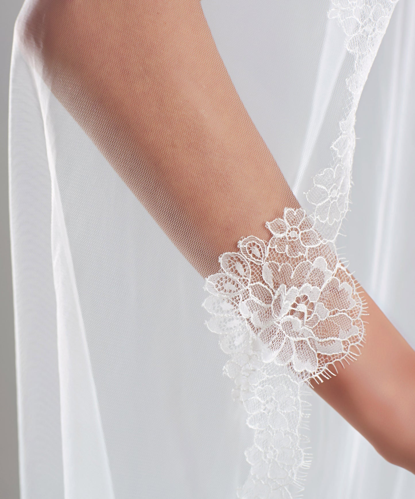 Este gran velo de novia nos encanta, ya que su encaje delinea exquisitamente a la novia que lo lleve puesto. Puedes prenderlo por debajo del recogido de la novia como por encima del peinado.