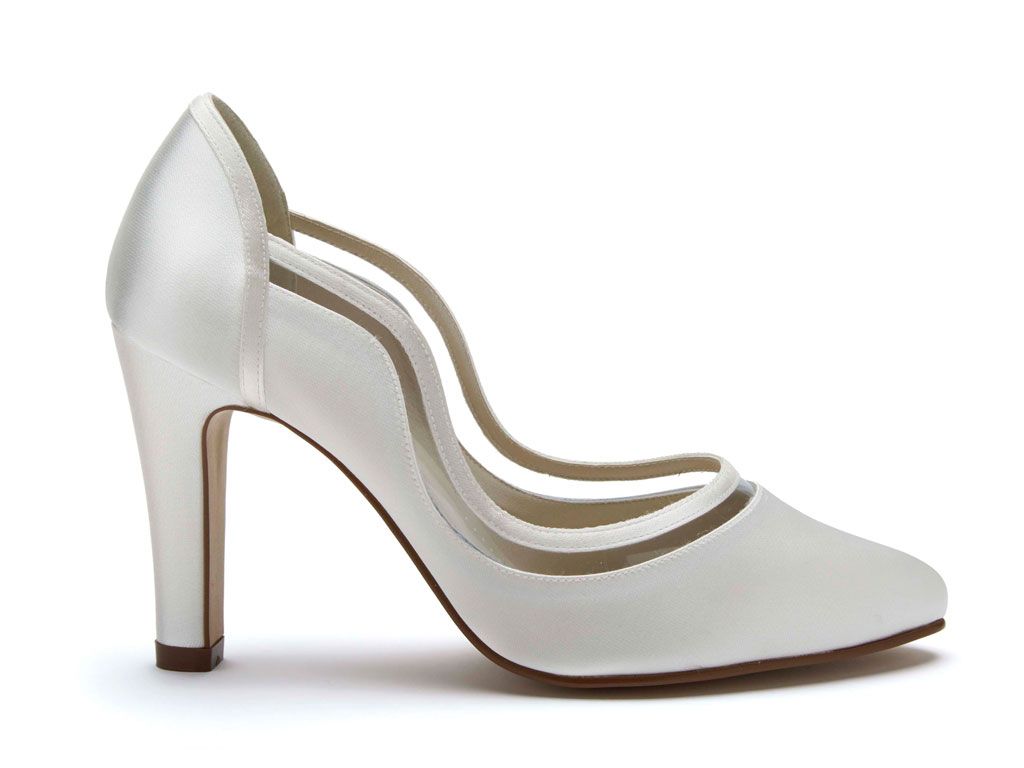 Confeccionados con satén, estos zapatos de salón para novia tienen una elegante punta, un tacón de bloque alto y un elegante detalle de vinilo que se curva alrededor del pie en una línea ondulada.