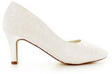 Los zapatos de novia Sodalita combinan la delicadeza del encaje sobre base en color ivory con un diseño clásico y sofisticado. Su tacón de 6.5 cm ofrece el equilibrio perfecto entre elegancia y comodidad, ideal para brillar en cada paso.